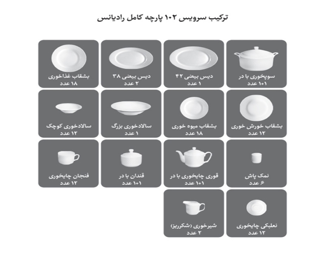 با چینی زرین طرح رادیاس سفید، زیبایی و سادگی را به میزهای خود بیاورید! این سرویس بینظیر با طراحی مینیمال و کیفیت بالای ساخت، انتخابی ایدهآل برای مهمانیها و کاربرد روزمره است. با این محصول شیک، مهمانانتان را تحت تأثیر قرار دهید و از وعدههای غذایی لذت ببرید. همین حالا سفارش دهید و تحول را تجربه کنید!